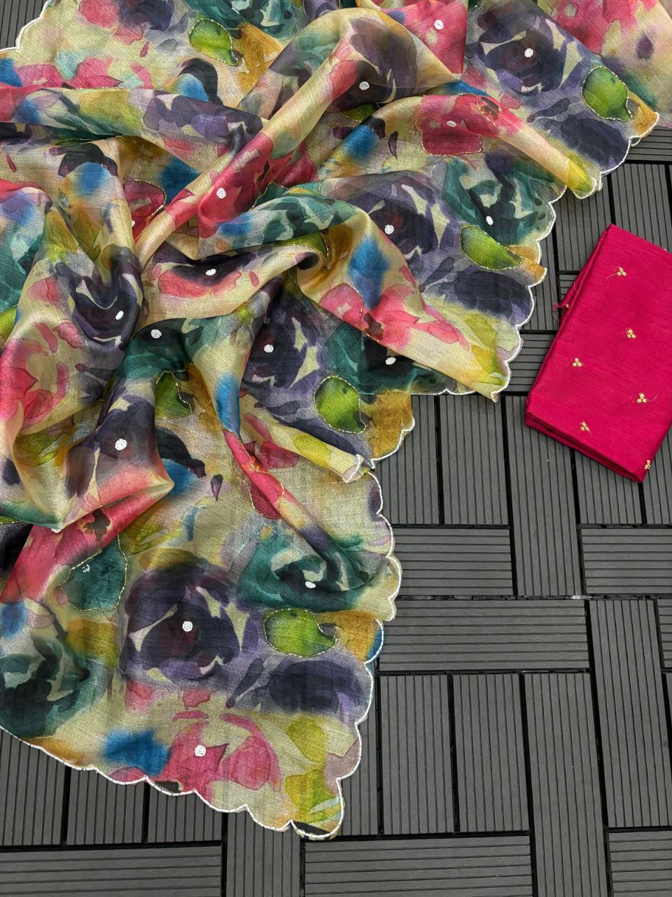 Kota-Doria Saree With Blouse And Embroidery Work