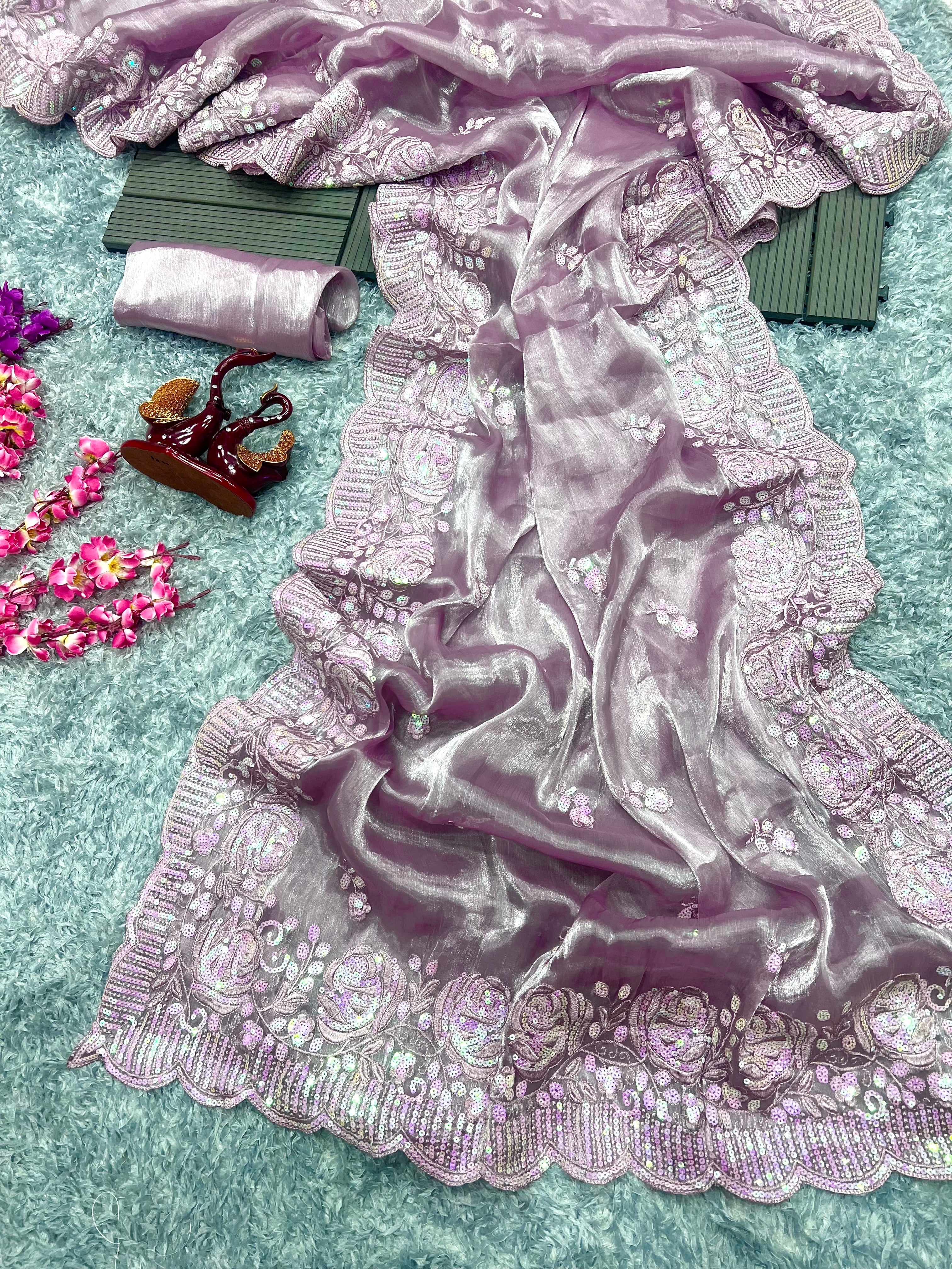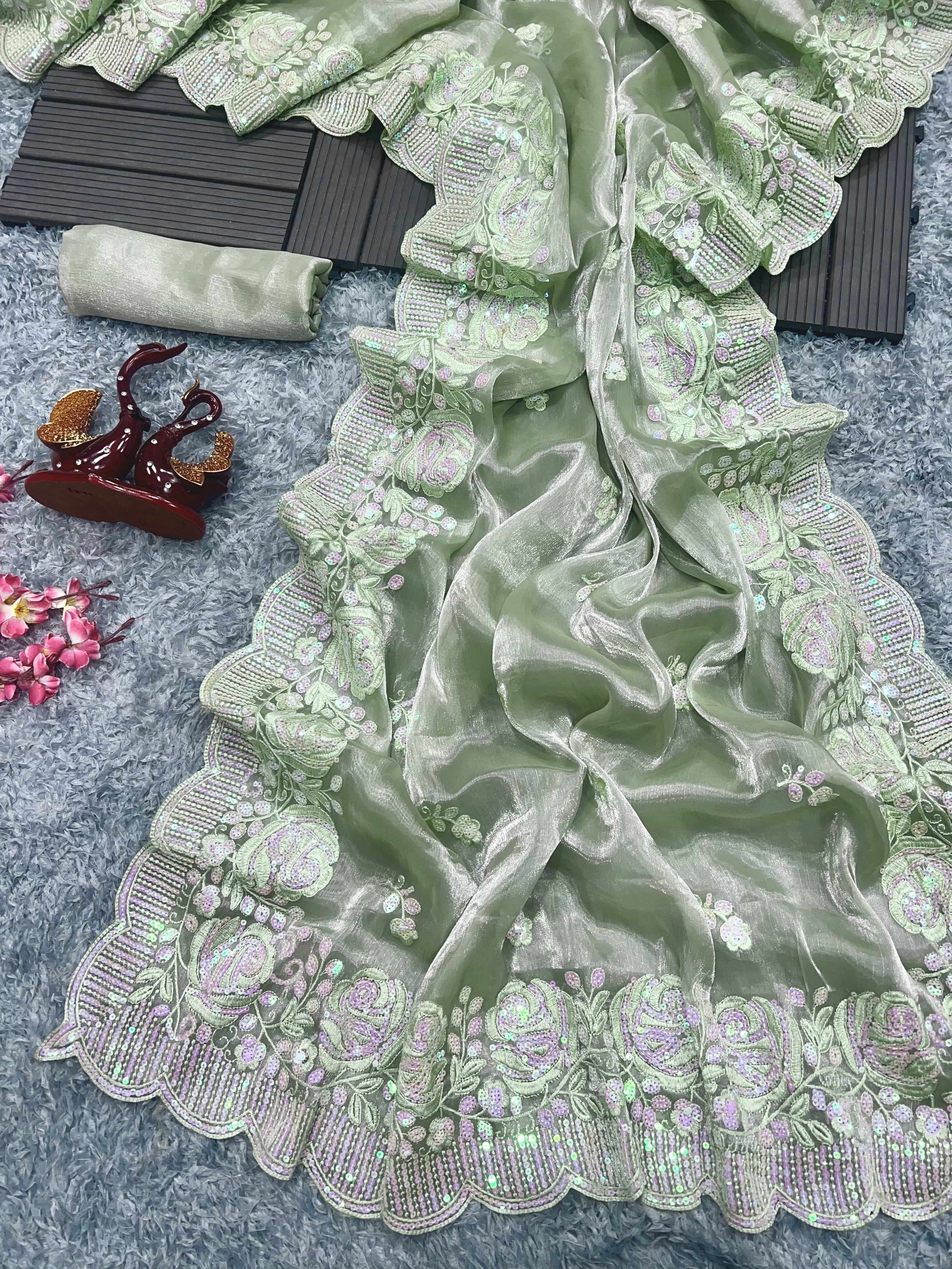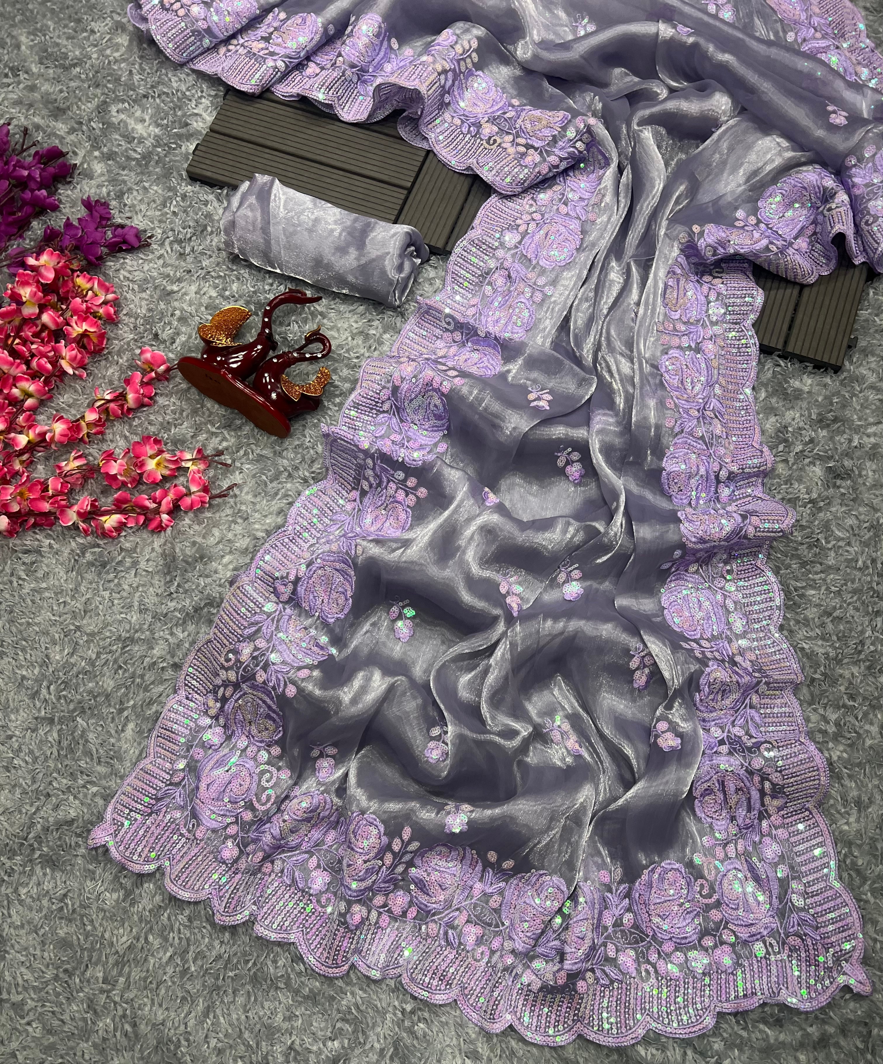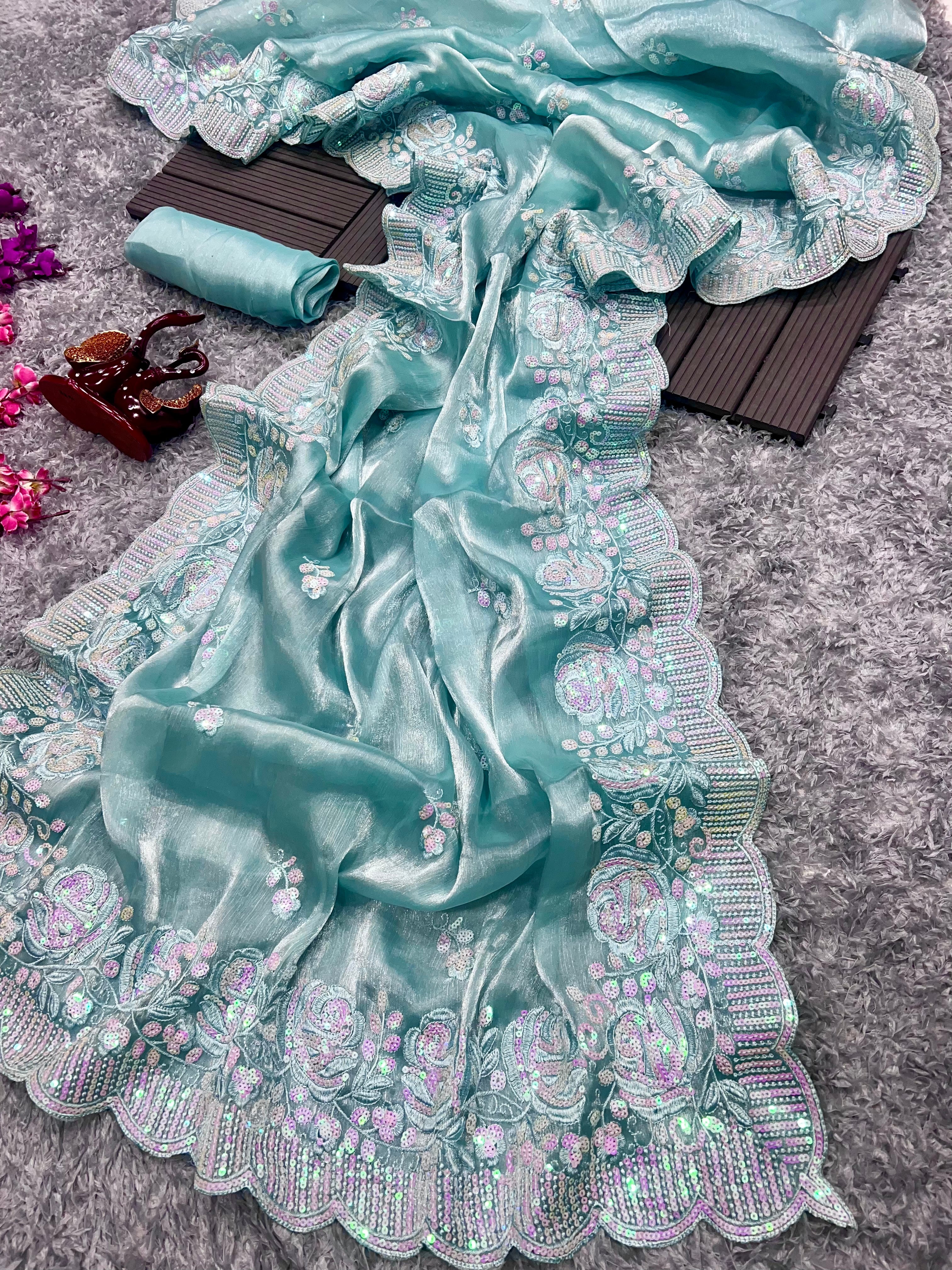 *😍Drape elegance in every hue! our mesmerizing saree with intricate embellishments are ready to steal the spotlight. complete with a stunning embroidered blouse, they're perfect for parties, festivals, and all your special moments. elevate your style effortlessly!*