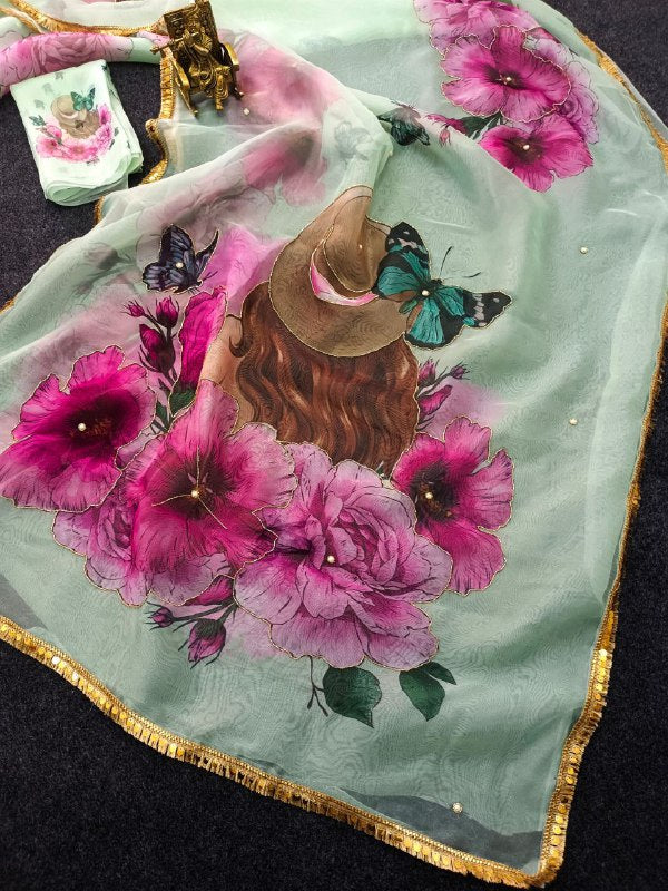 Soft pure organza printed with handwork sarees